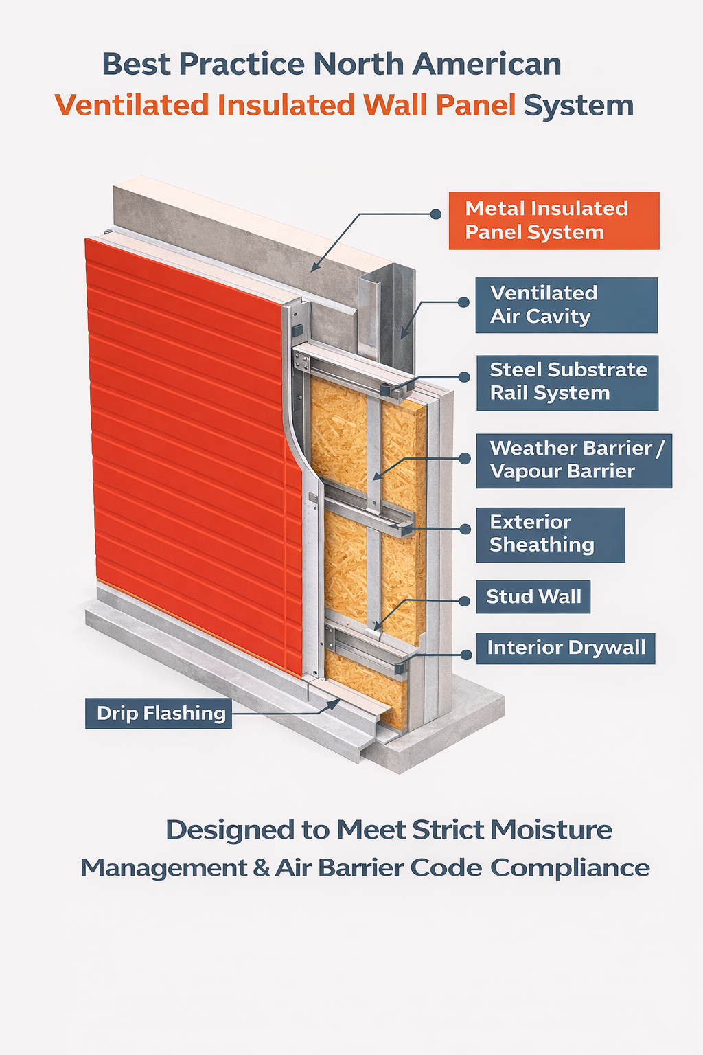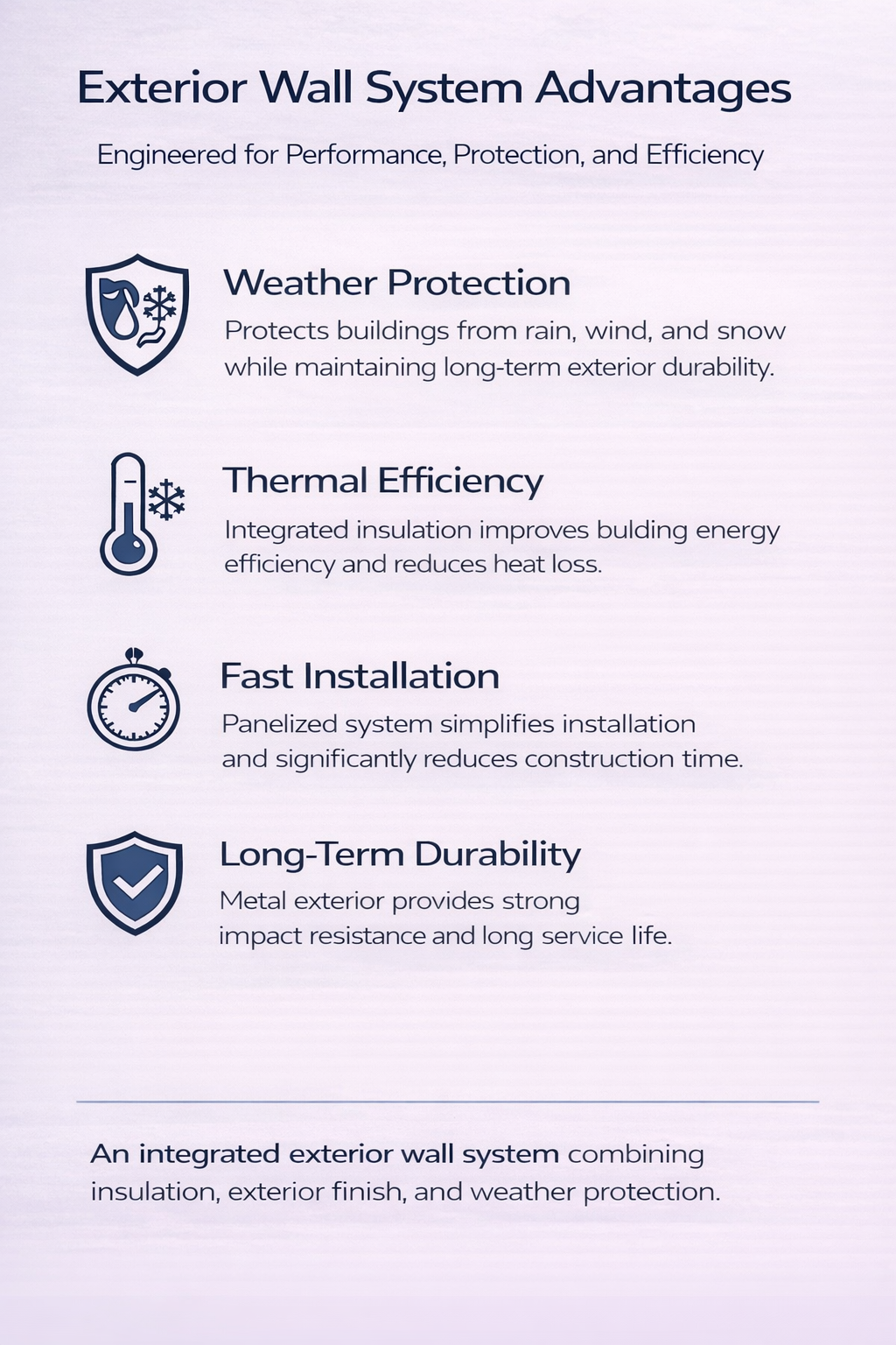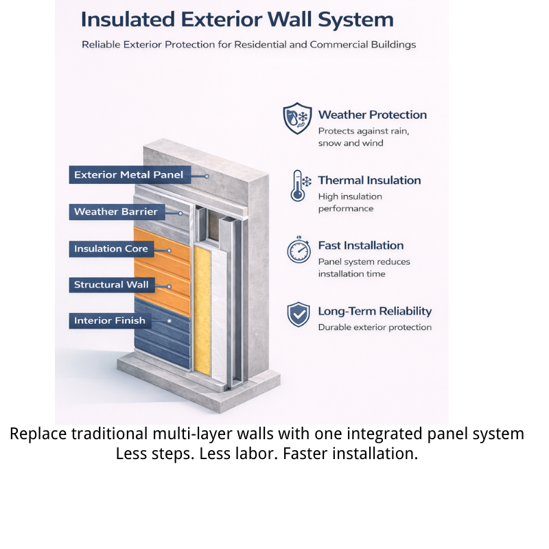 Our Integrated Insulated Wall System combines insulation and exterior finish into one engineered panel solution, significantly reducing installation time and improving overall building performance.